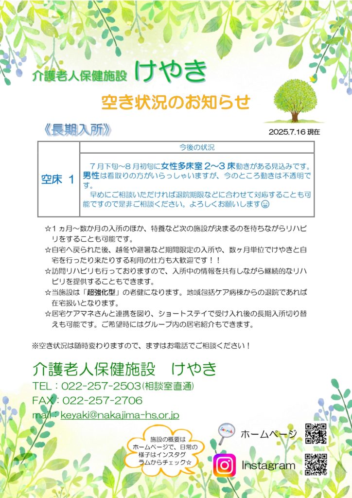 長期・短期入所、訪問リハビリ 空き状況(R7.7/16)