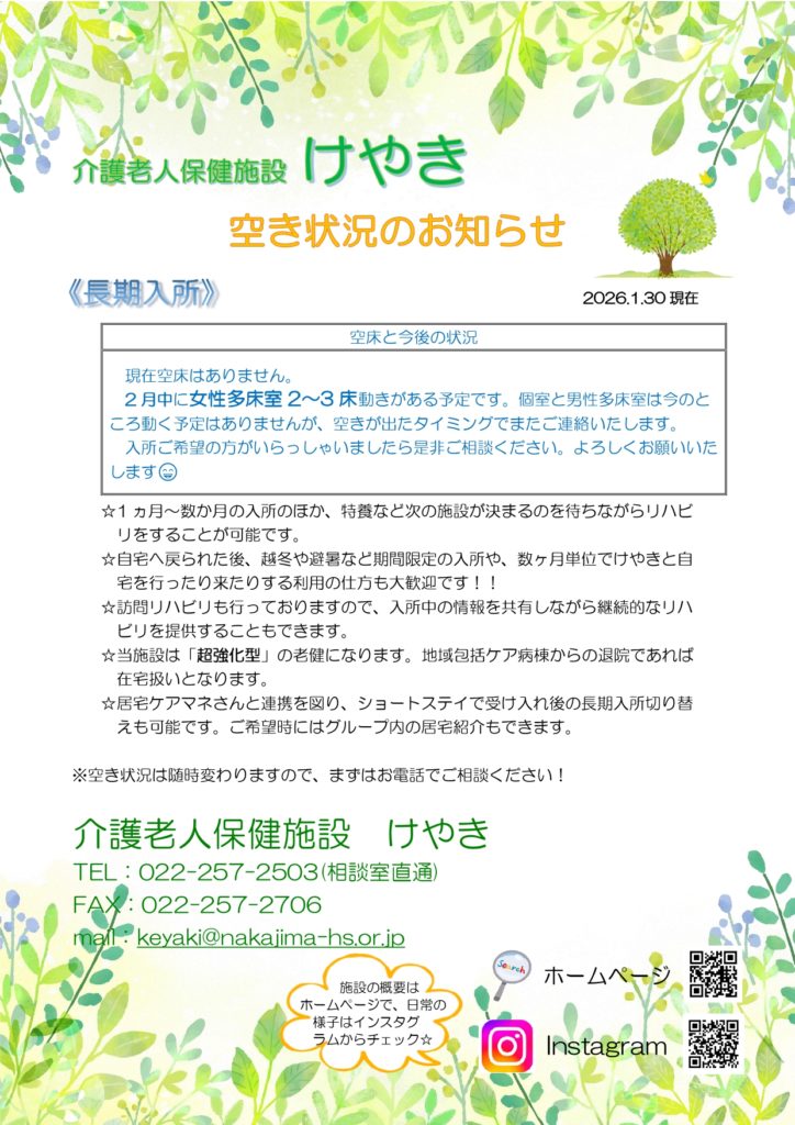 長期・短期入所、訪問リハビリ 空き状況(R8.1/30)