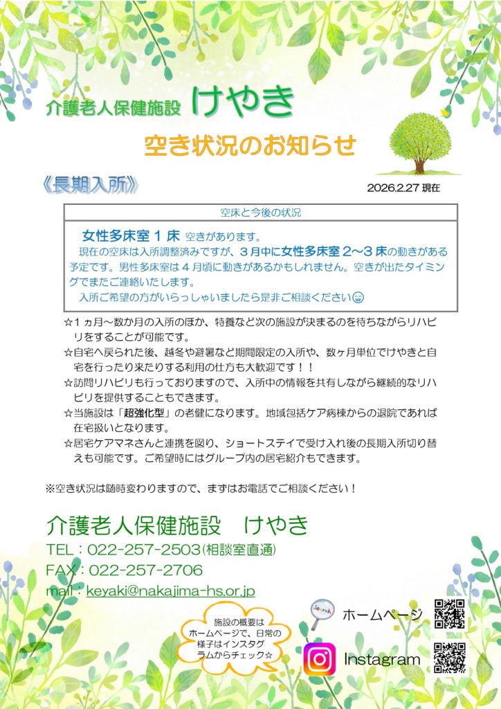 長期・短期入所、訪問リハビリ 空き状況(R8.2/27)